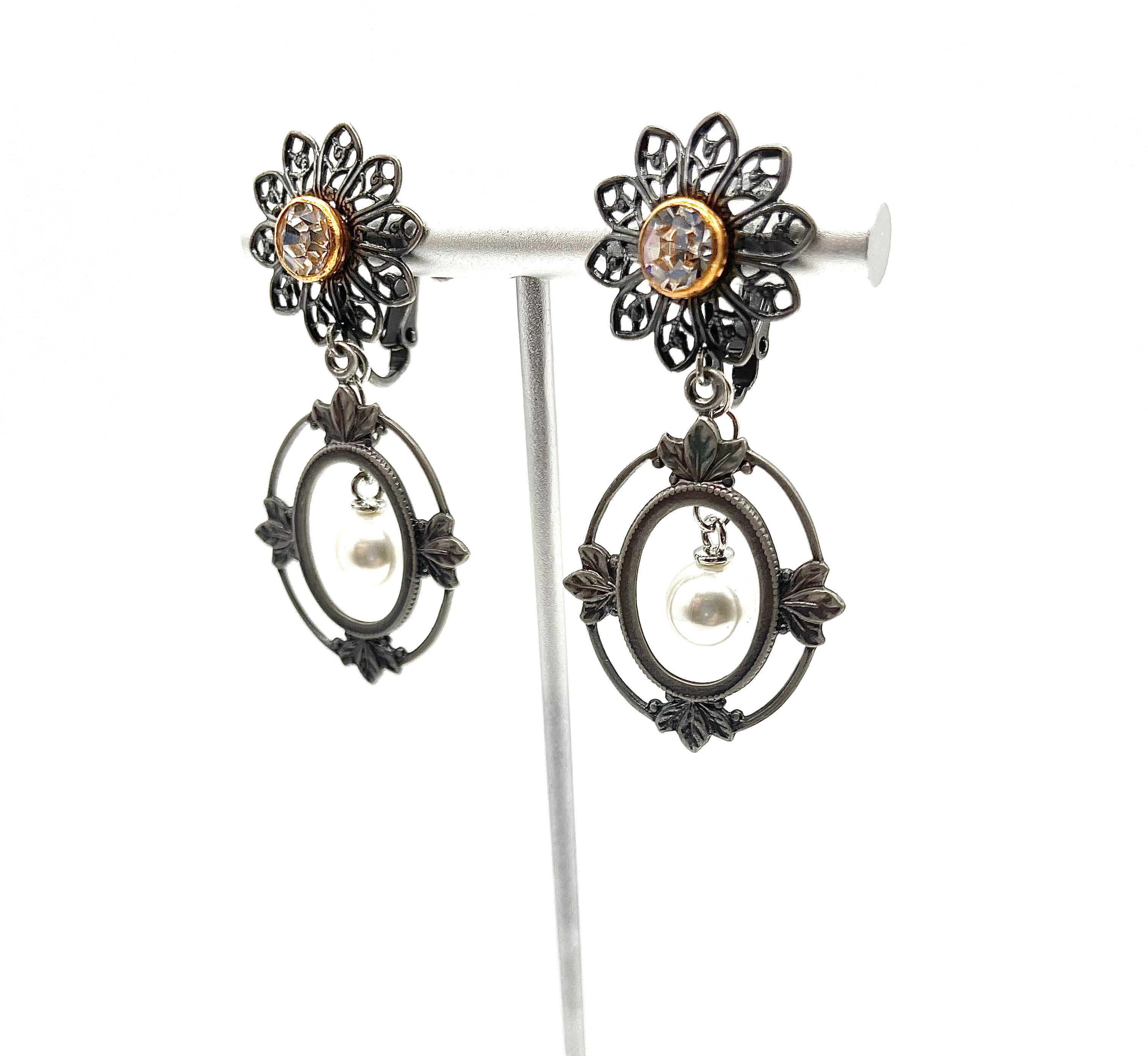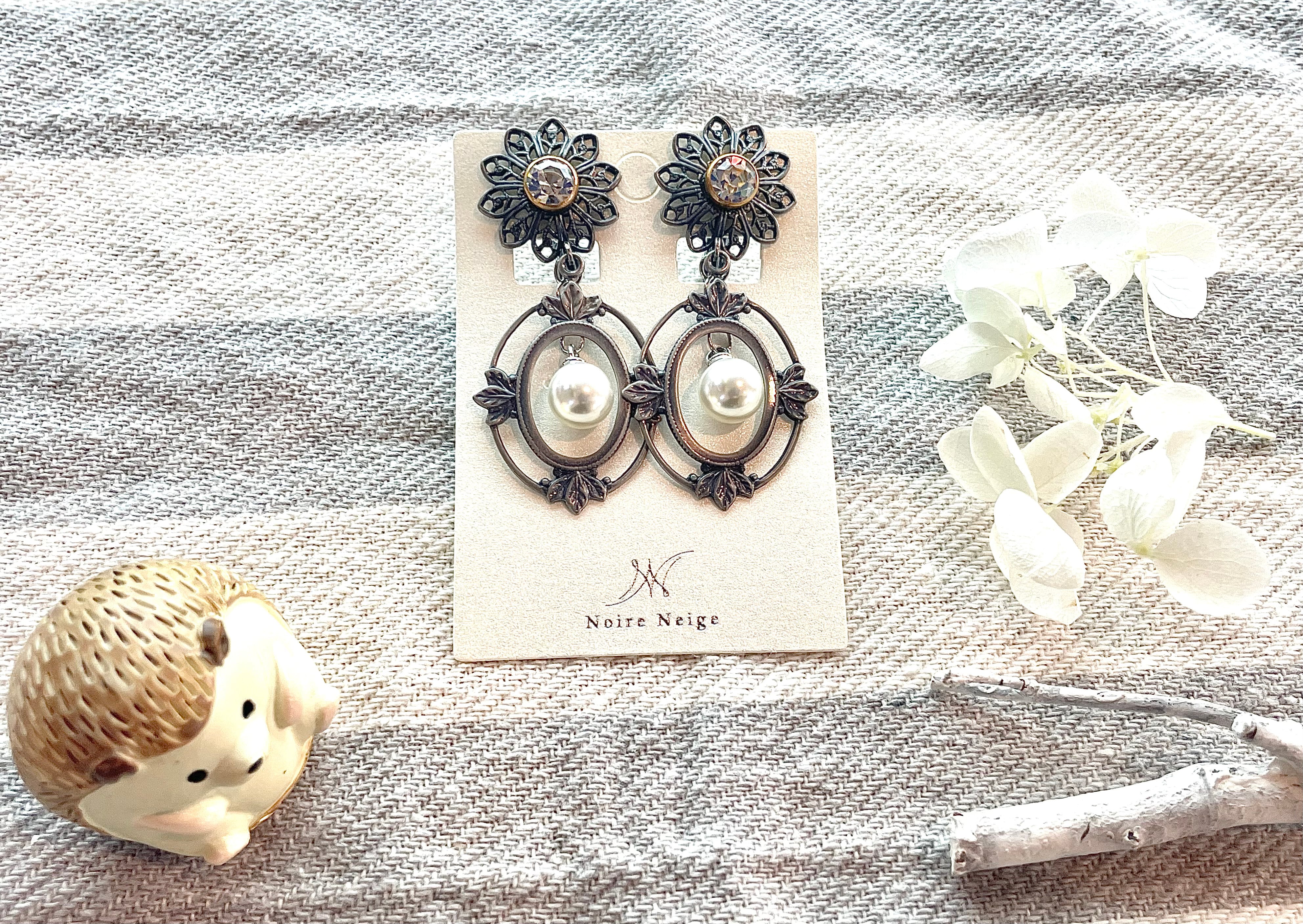 クリスタル石を中心に花びらが綺麗に咲いたイヤリングです。 クリスタルのもつ上品さは残しつつ、細かい透かし模様とアンティーク調の色合いが大人びた表情を覗かせます。 楕円モチーフの窓からパールが揺れる姿はとても可愛いく、ラフなスタイルのポイント使いもオススメです。 金古美は女性らしく華やかに、銀古美は涼しげでクールな印象を演出します。