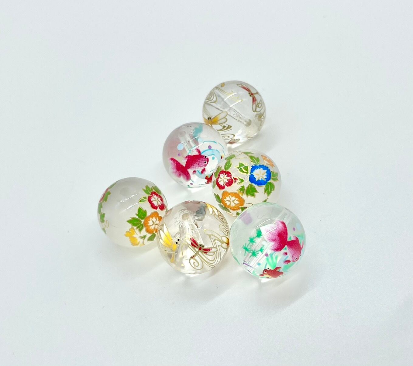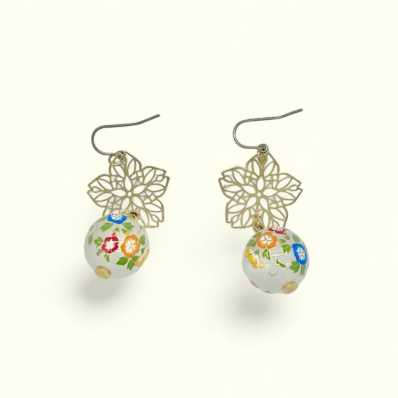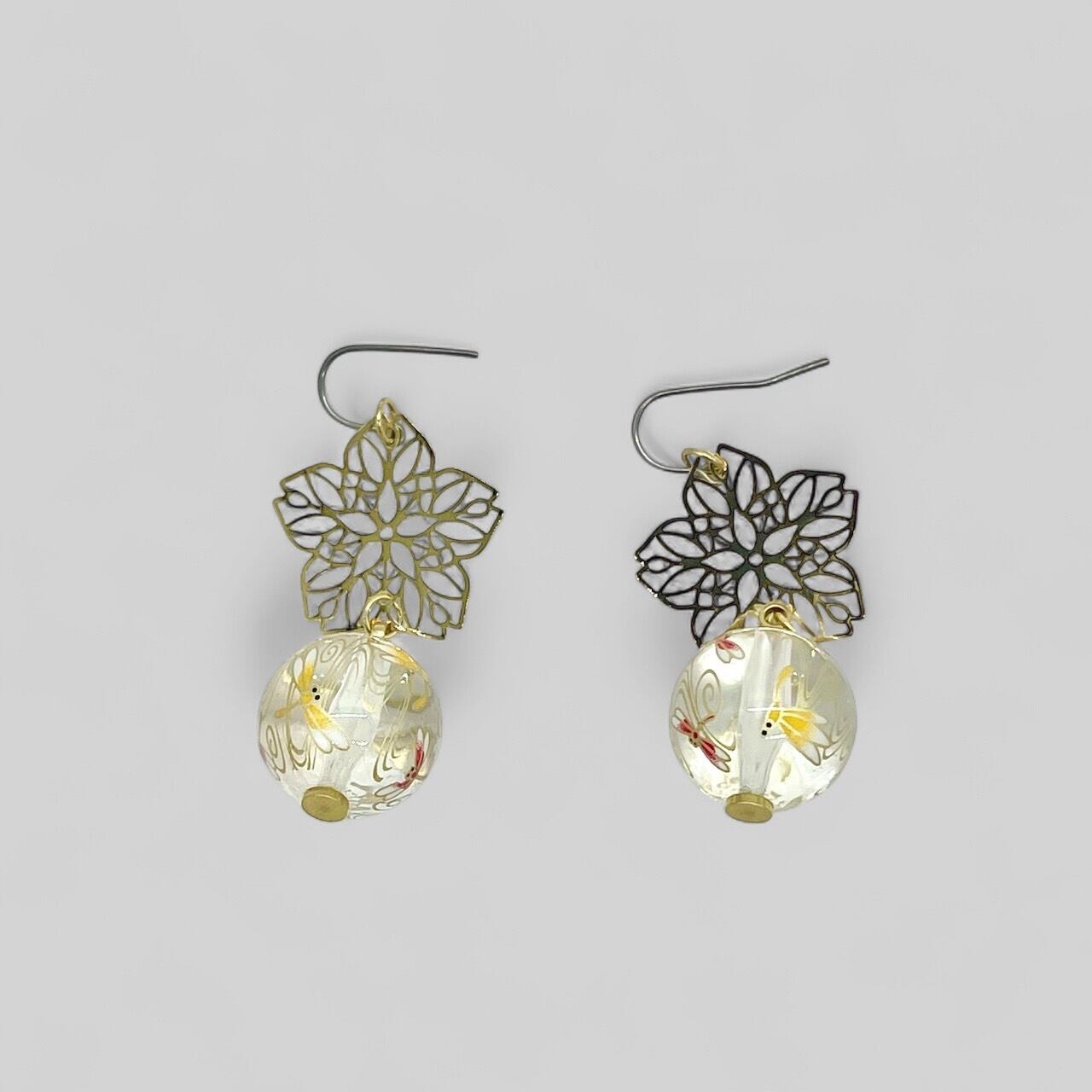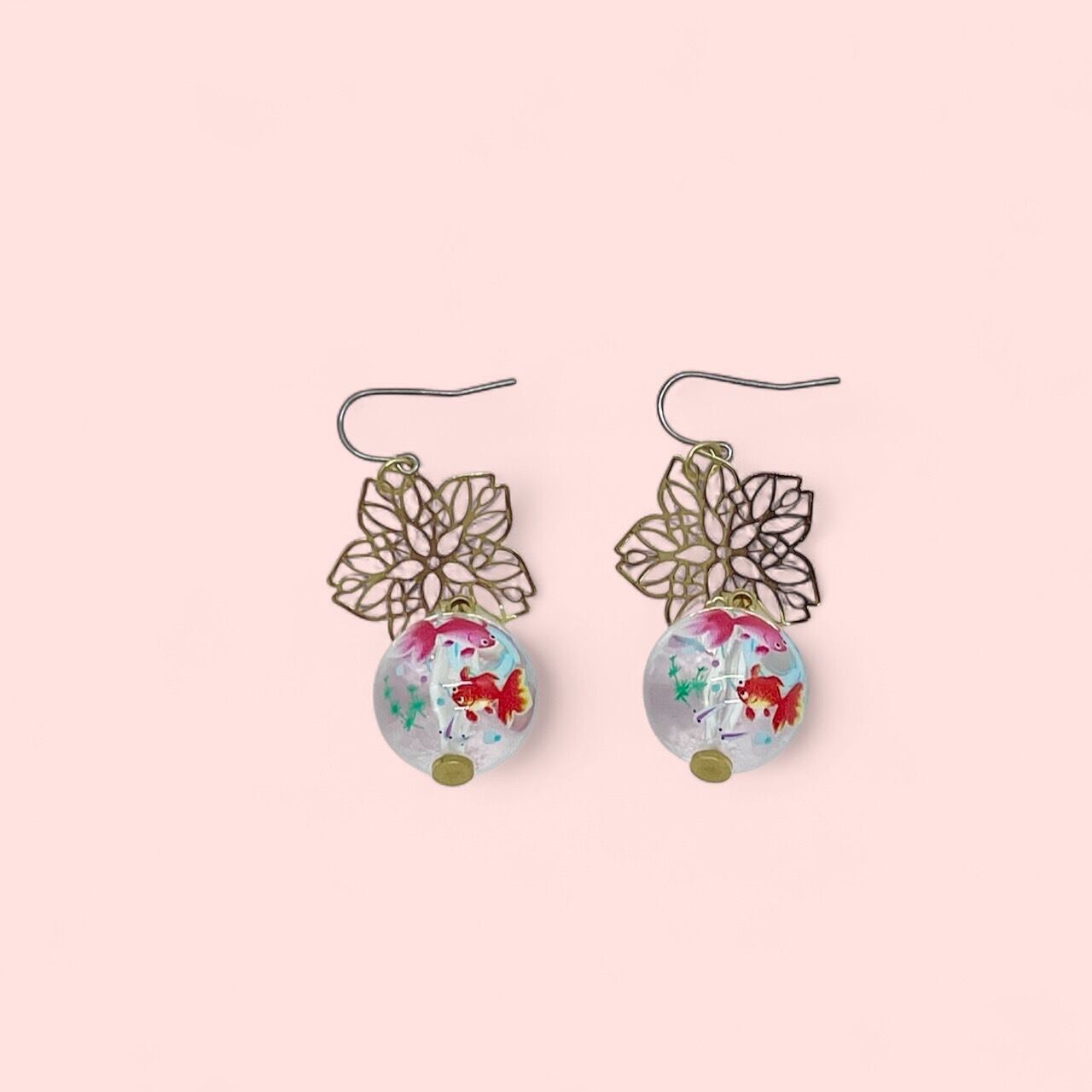 美しい和柄のプラスチックビーズがポイント。 3種類の伝統的な日本のモチーフをご用意しています。 金魚/朝顔/トンボ 軽量なチタン製のフィッシュフックが繊細な耳にも優しくフィットします。 ギフトにも、普段使いにも最適です。