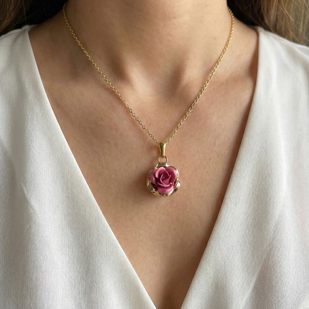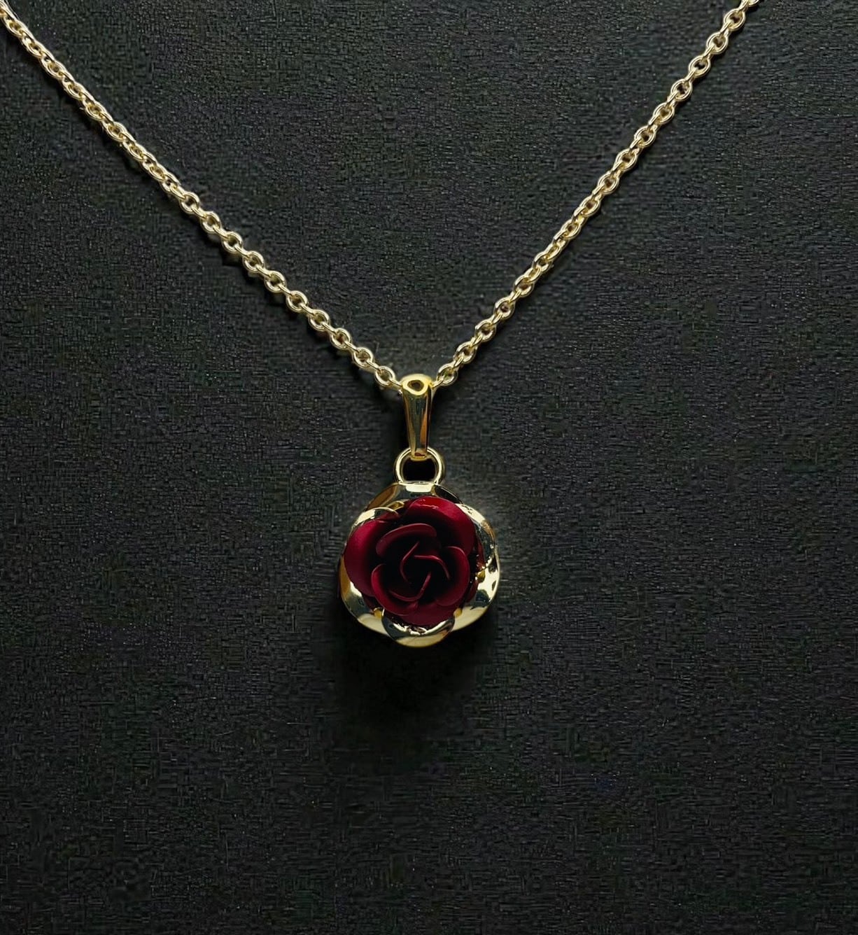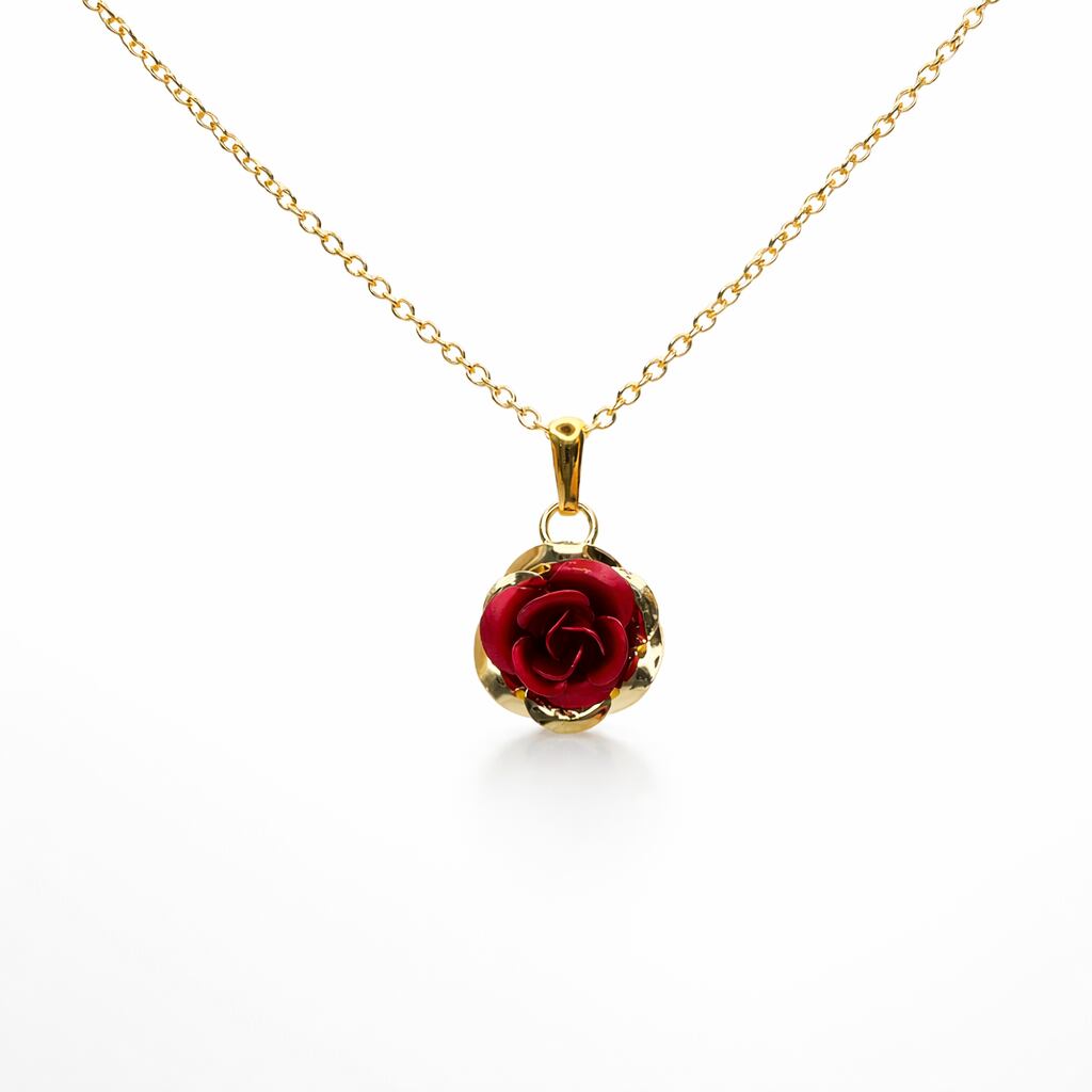 金属の花びらで表現した華やかな立体的なバラのネックレス。