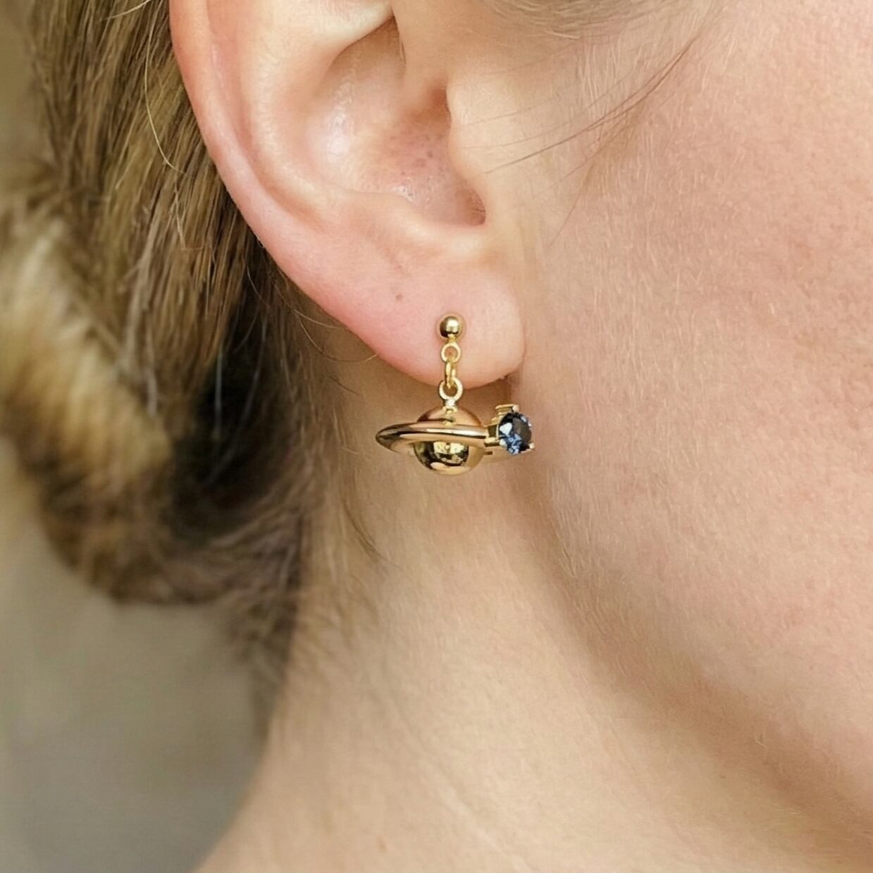 小さな惑星をモチーフにしたチャームをピアス金具から下げて揺れるようデザインした“軌道ピアス”。