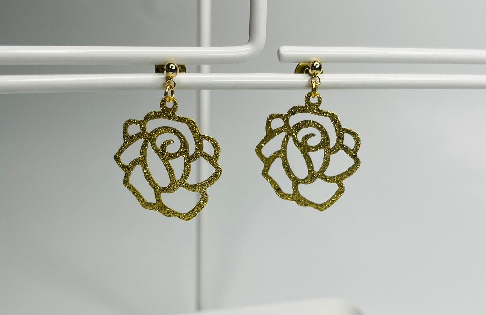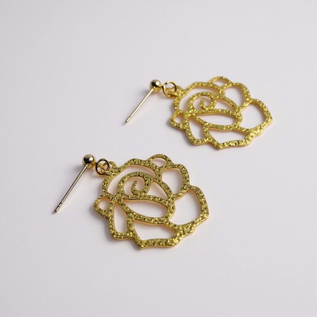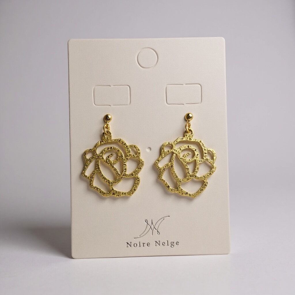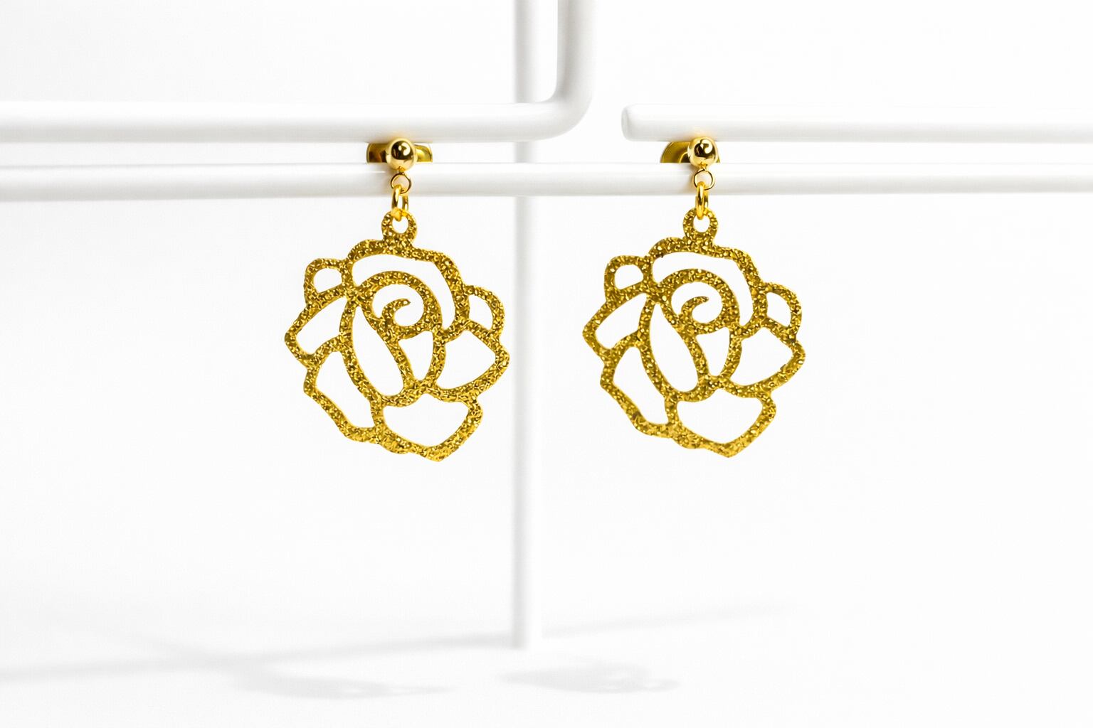 夜空に瞬く星屑を閉じ込めたような、スターダスト仕上げのバラモチーフピアス。
