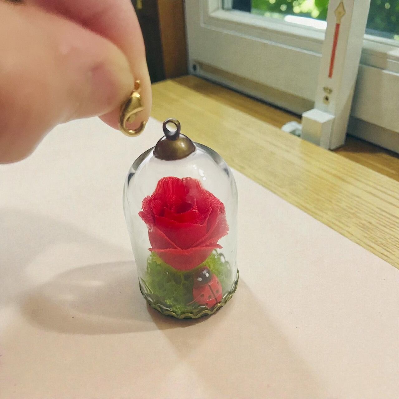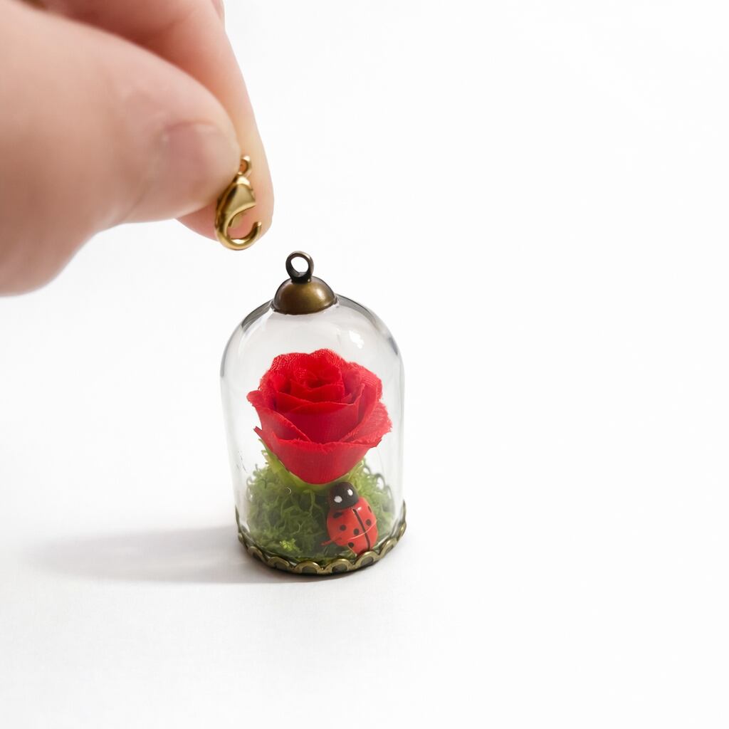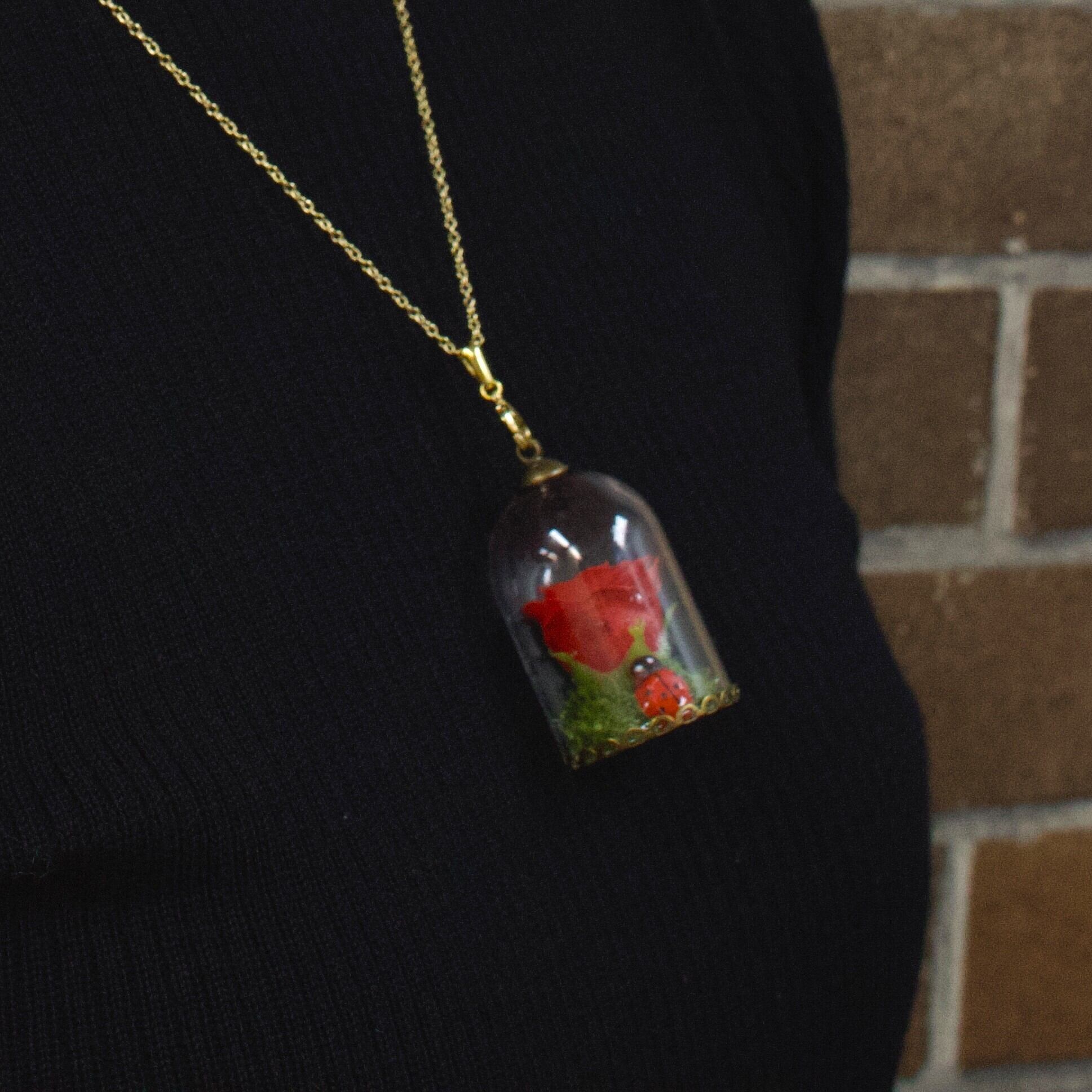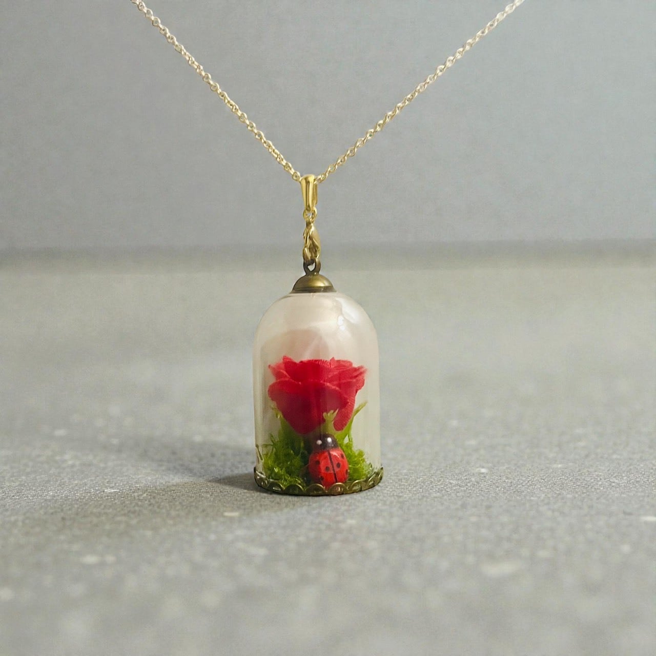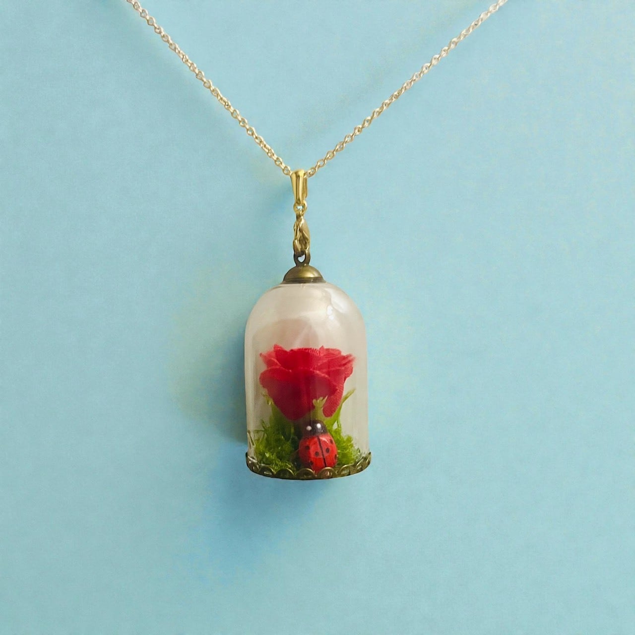 【お部屋のインテリアにも】てんとう虫のガラスドームローズネックレス|ミニチュアテラリウムペンダント|