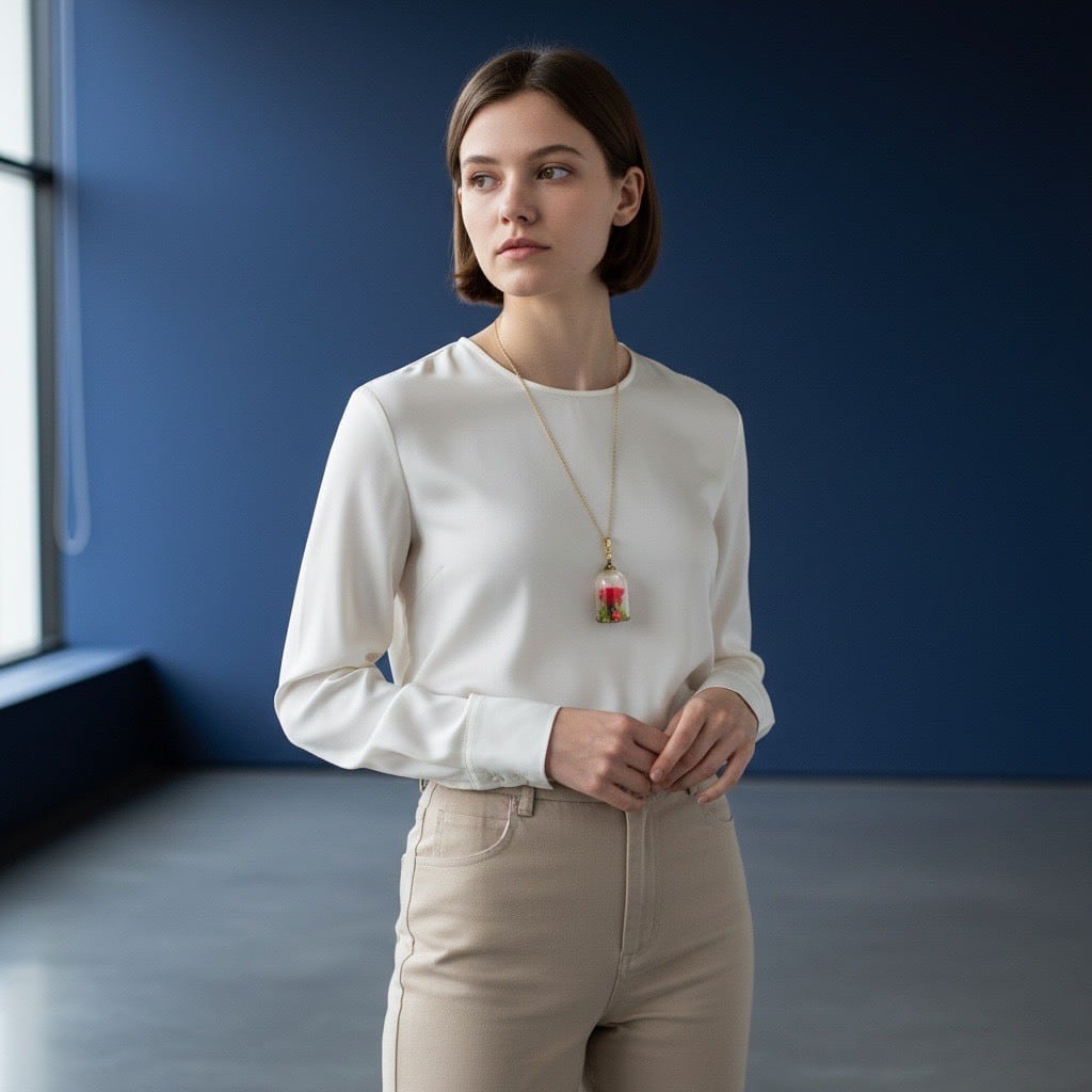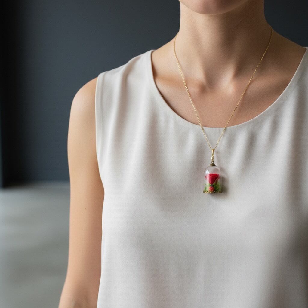 まるで物語のワンシーンを切り取ったような、“時間が止まった小さな庭” を閉じ込めたネックレスです。
