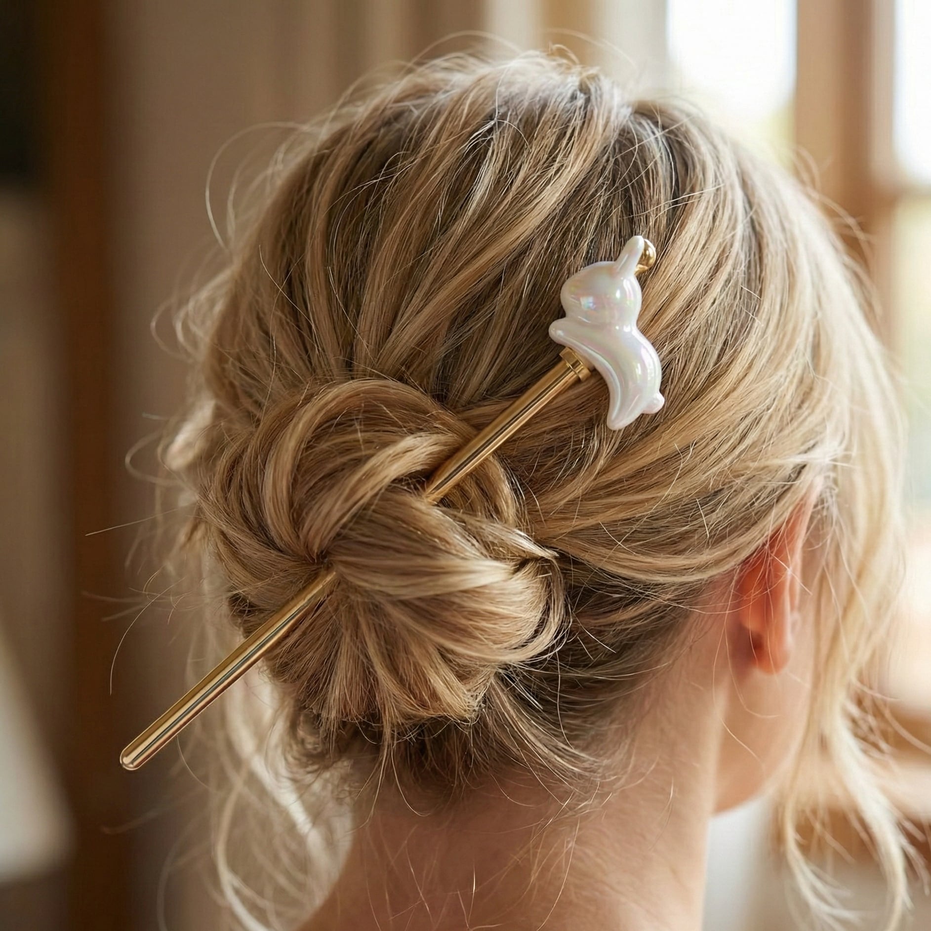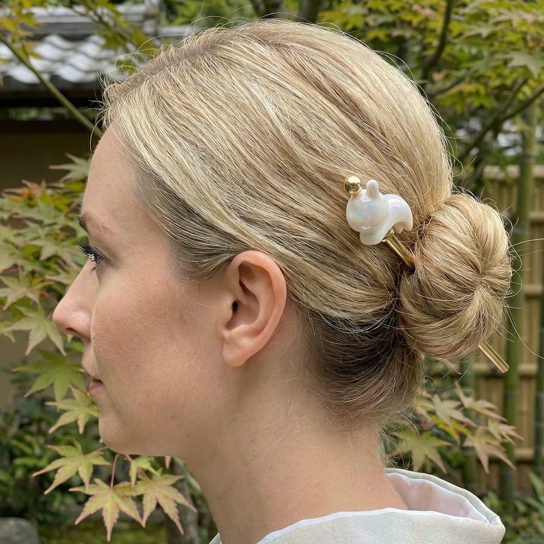 ヘアスタイルにそっと寄り添う、愛らしいうさぎモチーフのかんざしです。