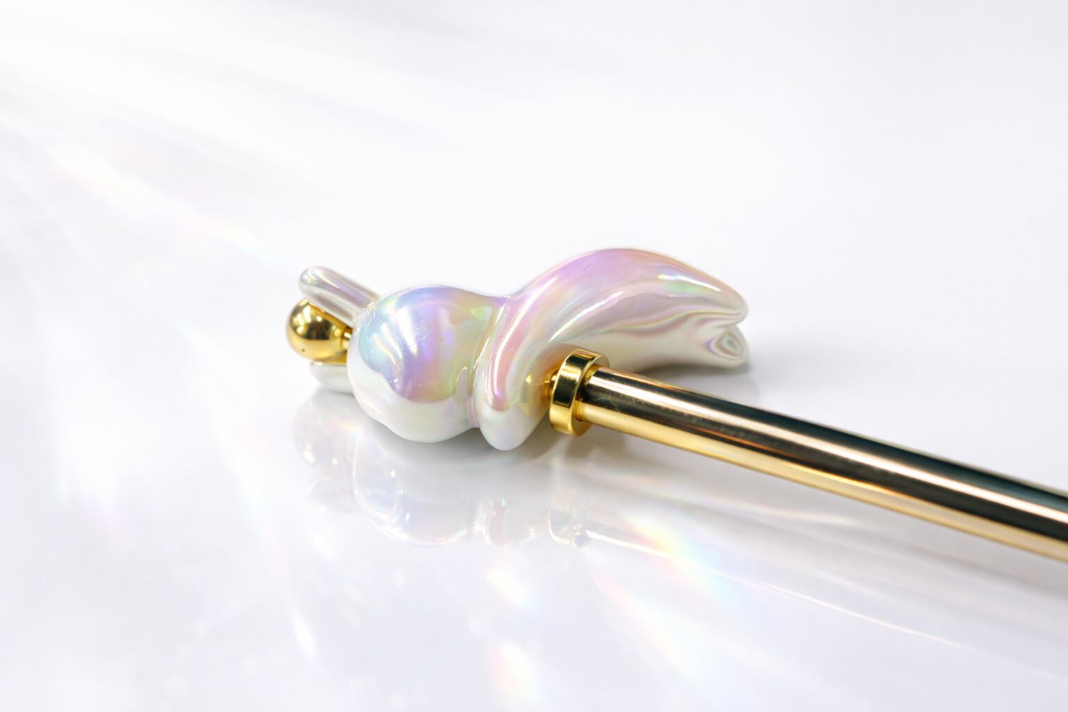 つるんとした立体的なフォルムのうさぎは、見る角度によってピンクやブルー、グリーンに表情を変える美しいオーロラカラー。