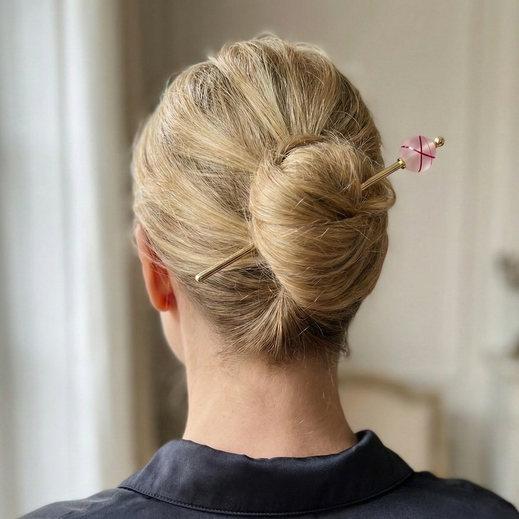 髪をゆるくまとめて、スティックを差し込むだけ。
