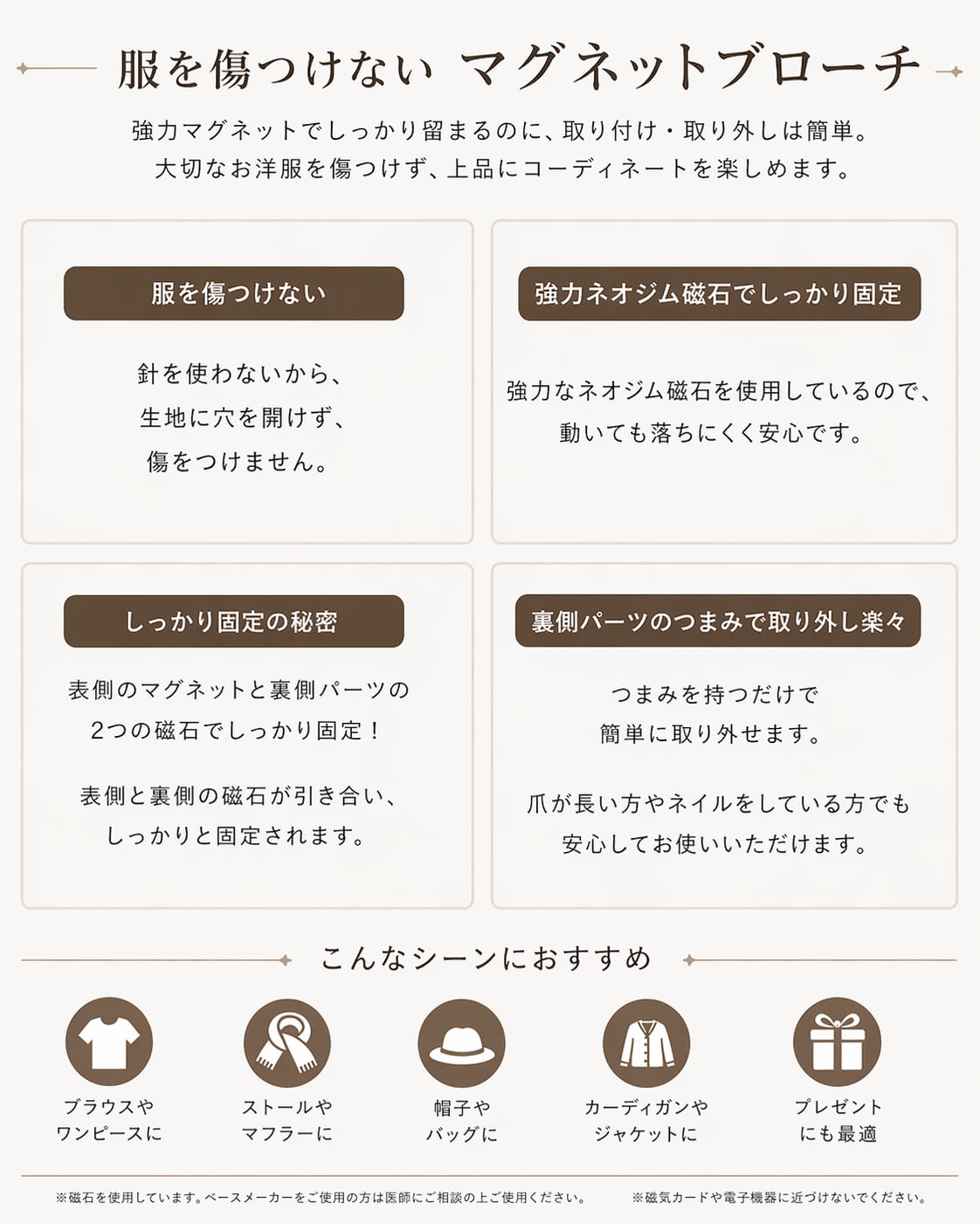 • 生地に穴を開けずに装着できるため、大切なお洋服を傷つけません。