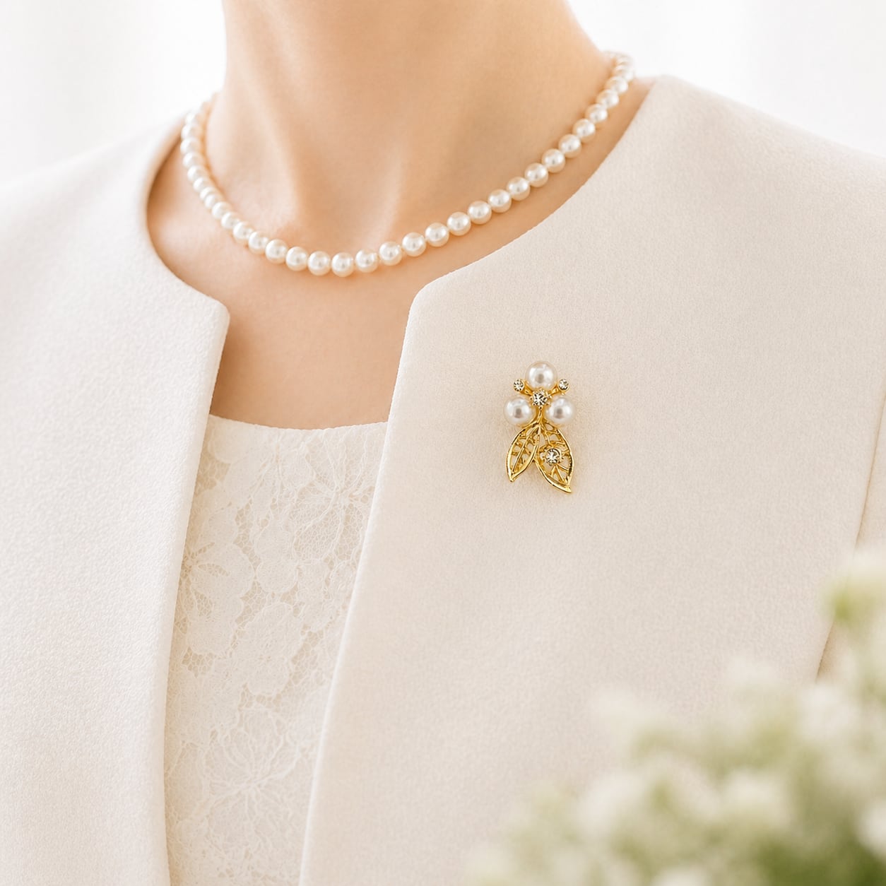 ジャケットやワンピースの胸元に添えるだけで、装いをワンランク上の印象に引き上げてくれるアイテムです。